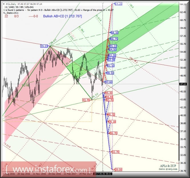 Развитие движения цены инструмента (#CL) в июне-июле 2017 г. будет обусловлено отработкой уровня сопротивления 47.60 (начальная линия SSL вил операционного масштаба Minor) и уровня поддержки 45.30 (начальная линия SSL вил операционного масштаба Minute).