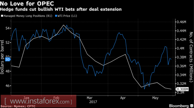 2017-06-06 14:46:34 (читать в оригинале)Управляющие активами продолжают избавляться от не оправдавшей надежд нефти, сократив нетто-лонги до минимальной отметки с октября, а «медведи» по Brent и WTI закрывают глаза на временные трудности и ведут котировки в направлении $44-46 за баррель. Рынок, похоже, совершенно не волнует ни пролонгация соглашения о сокращении добычи ОПЕК и других стран-производителей до конца марта 2018, ни тот факт, что запасы нефти в США падают на протяжении восьми недель подряд (-6,4 млн баррелей по итогам пятидневки к 26 мая), ни разрыв дипломатических отношений с Катаром со стороны Саудовской Аравии и других стран Ближнего востока.