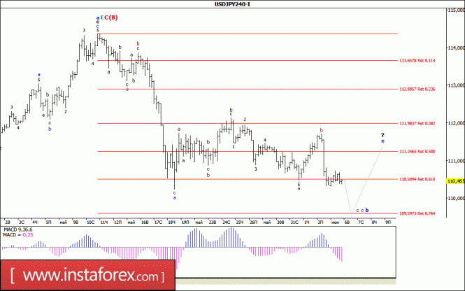 Вчерашний день пара USD/JPY провела в пределах достаточно узкого ценового диапазона, торгуясь вокруг отметки 110,50. При этом можно предположить, что, оставаясь в стадии формирования волны с, в b, в Е, в С, в (В), валютная пара несколько усложнила ее внутреннюю волну с. Если это так, то валютная пара сохранила потенциал, позволяющий ей возобновить снижение котировок, как минимум к отметке 109,60.
