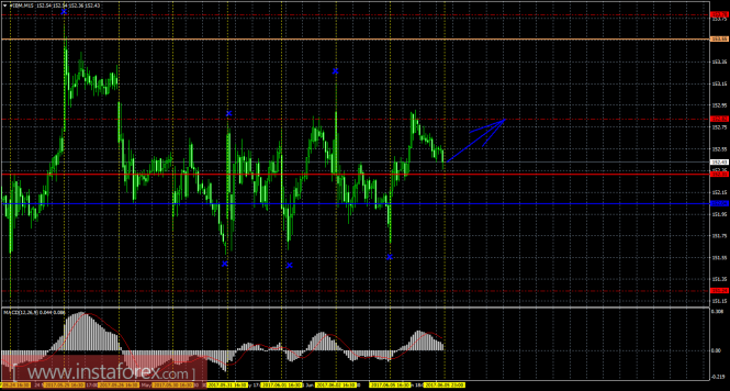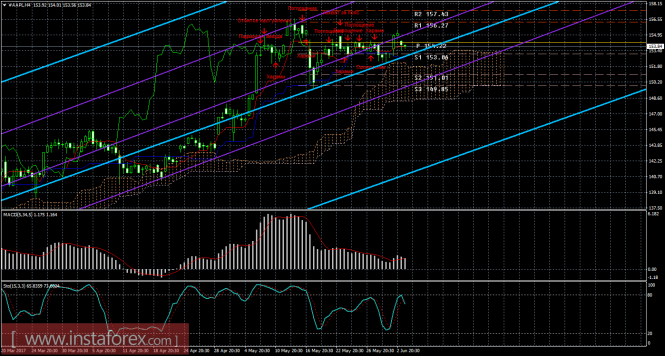 На 15-минутном графике рекомендуется рассматривать ордера на покупку с целью 156,27 при закреплении цены выше 153,80 (Тенкан-сен), ордером Stop Loss ниже 153,80 и при направленном вверх индикаторе MACD.