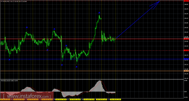 Индикатор MACD – красная линия и гистограмма с белыми барами в окне индикаторов.Материал предоставлен компанией InstaForex - www.instaforex.comВолновой анализ валютной пары USD/JPY за 6 июня 2017 года