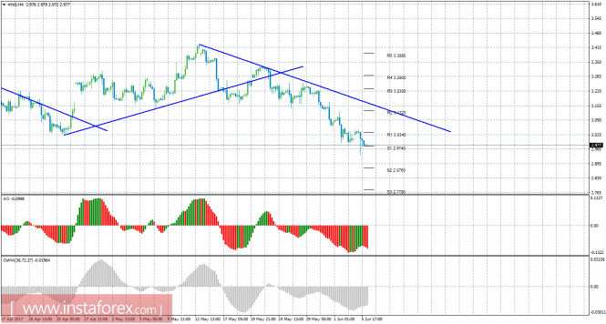 Анализ природного газа за 6 июня показывает, что цена в начале новой недели по-прежнему располагается между уровнями R1 и S1 и не определилась с направлением движения. На данный момент актуально нисходящее движение с целями уровни поддержки S2 – 2,8760 и S3 – 2,7780, если цена преодолеет 2,9740. Целями для восходящей коррекции выступают уровни 3,1320 и 3,2300, если цена закрепится выше 3,0340. Новая нисходящая линия тренда поддерживает сейчас торгующих на понижение и делает актуальными ордера на продажу. Если цена закрепится выше нее, это укажет на смену тенденции на рынке и станут актуальными ордера на покупку. Индикатор Awesome показывает локальное нисходящее движение, последний закрытый бар окрашен в красный цвет. OsMA направлен вверх, что сигнализирует о восходящем движении цены на газ в более долгосрочной перспективе.