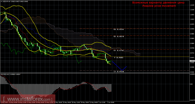 Красная линия и гистограмма с белыми барами в окне индикаторов.Материал предоставлен компанией InstaForex - www.instaforex.comТехнический анализ и торговые рекомендации по валютной паре USD/CHF на 5 июня 2017 года