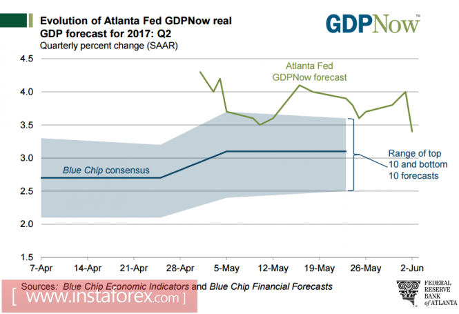 Доллар среагировал снижением, хотя еще днем ранее казалось, что он, наконец, может получить позитивный импульс. Индекс PMI от Markit в мае составил 52.7п, что на 0.2п выше уровня апреля, аналогичный индекс от ISM также вырос с 54.8п до 54.9п. Эти данные позволили аналитикам из ФРБ Атланты повысить прогноз по темпам роста ВВП во 2 квартале до 4.0% однако пятница внесла свои коррективы, и на текущий момент прогноз снизился до 3.4% что является минимальным значением за месяц.