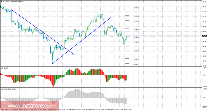 Уровни поддержки и сопротивления – красные горизонтальные линии.Материал предоставлен компанией InstaForex - www.instaforex.comТехнический анализ сырой нефти за 5 июня 2017 года