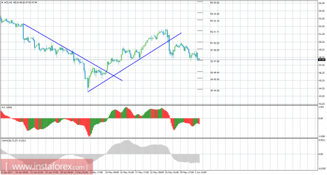 Уровни поддержки и сопротивления – красные горизонтальные линии.Материал предоставлен компанией InstaForex - www.instaforex.comТехнический анализ сырой нефти за 2 июня 2017 года