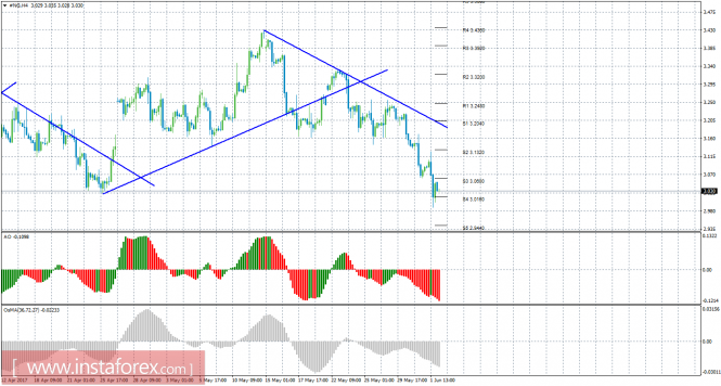 Анализ природного газа за 2 июня показывает, что цена возобновила движение вниз и отработала уровень поддержки S4, от которого отскочила. На данный момент актуально нисходящее движение с целью уровень поддержки S5 – 2,9440, если цена преодолеет 3,0160. Целями для восходящей коррекции выступают уровни 3,0600 и 3,1320, если цена останется выше 3,0160. Новая нисходящая линия тренда поддерживает сейчас торгующих на понижение и делает актуальными ордера на продажу. Если цена закрепится выше нее, это укажет на смену тенденции на рынке и станут актуальными ордера на покупку. Индикатор Awesome показывает локальное нисходящее движение, последний закрытый бар окрашен в красный цвет. OsMA также направлен вниз, что сигнализирует о нисходящем движении цены на газ и в более долгосрочной перспективе. Отскок от 3,0160 мог спровоцировать коррекционное движение.