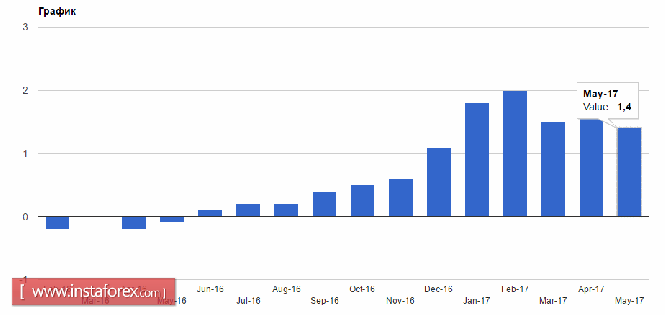 Согласно данным статистического агентства ЕС, предварительный индекс потребительских цен в мае этого года вырос лишь на 1,4% по сравнению с тем же периодом предыдущего года после роста на 1,9% в апреле. Стоит отметить, что данный уровень инфляции является самым низким в этом году. Экономисты прогнозировали уровень инфляции 1,5%. Базовая инфляция, которая учитывает волатильные категории товаров, а также цены на энергоносители, упала в мае до 0,9% против 1,2% в апреле.