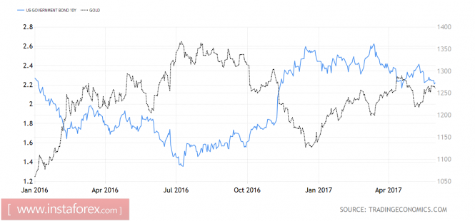 2017-05-31 14:35:26 (читать в оригинале)Возвращение Дональда Трампа во враждебную обстановку на родине, слухи о пропуске Грецией платежей по долгам в июле и о досрочных выборах в Италии, а также рост риска протекционизма в мировой торговле усилили спрос инвесторов на активы-убежища. Золото вернулось к максимальной отметке с начала мая, используя падение доходности казначейских облигаций США в качестве мощного драйвера роста. Несмотря на то что вопрос с повышением ФРС ставки по федеральным фондам в июне практически решен, все больше представителей FOMC выражают беспокойство замедлением инфляции, а в таких условиях шансы на продолжение цикла нормализации денежно-кредитной политики в сентябре падают, что оказывает давление на американский доллар.