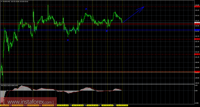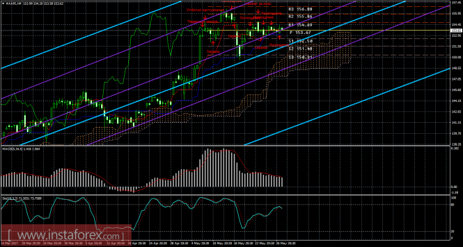 На 15-минутном графике рекомендуется рассматривать ордера на покупку с целью 154,69 при закреплении цены выше 153,70 (Тенкан-сен), ордером Stop Loss ниже 153,70 и при направленном вверх индикаторе MACD.