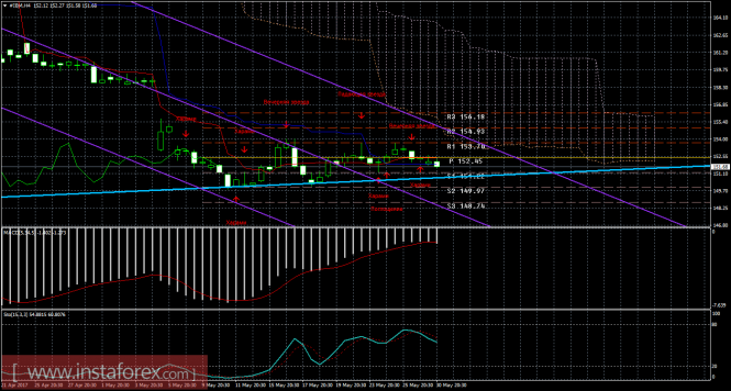Анализируя акции компании Apple 31 мая, видно, что цена сейчас не может ни возобновить восходящий тренд, ни продолжить нисходящую коррекцию. Текущий «золотой крест» является сильным (так как цена располагается выше облака), поэтому лонги индикатор Ишимоку разрешает рассматривать. Оба канала линейной регрессии направлены вверх, поэтому длинные позиции актуальны и по этому признаку. Целью для восходящего движения инструмента является сейчас первый уровень сопротивления 154,69. В случае преодоления этого таргета, целью будет выступать уровень сопротивления 155,86. Сформировалась новая бычья модель «Поглощение», которая сигнализирует о возможном завершении коррекции. MACD по-прежнему направлен вниз, сигнализируя о нисходящем движении, если индикатор развернется обратно наверх, это просигнализирует о возможном возобновлении восходящего тренда. Стохастик покинул область перекупленности, но линия индикатора направлена вверх, что сейчас свидетельствует о неопределенном настроении участников рынка. На младшем графике видно, что цена закрепилась выше линии Тенкан-сен, а последний верхний фрактал обновлен, что говорит либо в пользу флэта на старшем графике, либо в пользу завершения коррекции. Таким образом, ордера на покупку с целью уровень сопротивления 154,69 можно сейчас рассматривать. Закрепление ниже линии Тенкан-сен укажет на новый виток локальной коррекции.