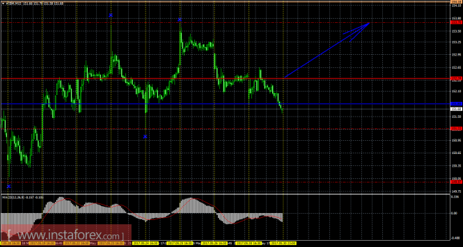 На младшем графике рекомендуется рассматривать ордера на покупку с целью 153,70 при открытии выше 152,39 (Тенкан-сен), ордером Stop Loss выше 152,39 и при направленном вверх индикаторе MACD.