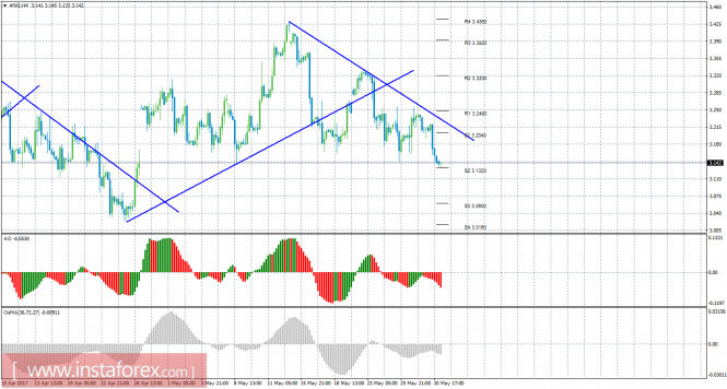 Анализ природного газа за 31 мая показывает, что цена возобновила движение вниз и отработала уровень поддержки S2. На данный момент актуально нисходящее движение с целями уровни поддержки S3 – 3,0600 и S4 – 3,0160, если цена преодолеет 3,1320. Целью для восходящей коррекции по-прежнему выступает линия тренда, если цена отскочит от 3,1320. Новая нисходящая линия тренда поддерживает сейчас торгующих на понижение и делает актуальными ордера на продажу. Если цена закрепится выше нее, это укажет на смену тенденции на рынке и станут актуальными ордера на покупку. Индикатор Awesome показывает локальное нисходящее движение, последний закрытый бар окрашен в красный цвет. OsMA также направлен вниз, что сигнализирует о нисходящем движении цены на газ и в более долгосрочной перспективе. Отскок от 3,1320 может спровоцировать коррекционное движение.