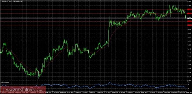 Курс фунта стерлингов 26 мая вновь закрепился ниже мувинга и на этот раз продолжил нисходящее движение. Старший канал направлен наверх, что свидетельствует о восходящем направлении глобального тренда. Младший канал также направлен наверх, что означает восходящее направление движения и в менее долгосрочном плане. Цена сейчас находится ниже уровня Мюррея «6/8», а также ниже скользящей средней, что говорит в пользу нисходящей тенденции. Текущей целью нисходящего движения остается уровень Мюррея «5/8» - 1,2817, но шорты сейчас не актуальны. Если этот таргет будет преодолен, то новой актуальной целью будет выступать уровень Мюррея «4/8» - 1,2695. Индикатор Хайкен Аши окрасил последние бары в голубой цвет, что свидетельствует о локальном нисходящем движении, однако при любой направленности индикатора короткие позиции сейчас не рекомендуется открывать. Скользящая средняя линия направлена вниз, а цена в свою очередь находится ниже нее, поэтому сейчас более актуальна нисходящая тенденция. Ордера на продажу можно будет рассматривать только после разворота вниз любого канала. Лонги станут актуальными только выше мувинга. Индикатор CCI находится около уровня -200, что обозначает наличие сильной перепроданности валютной пары, в ближайшее время ожидается восходящий откат.