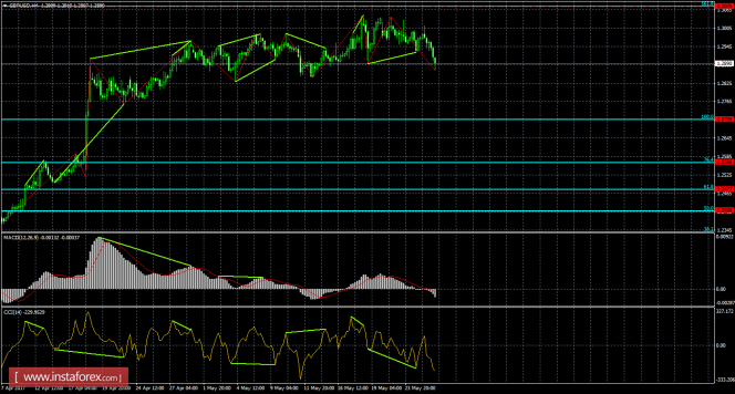 Бычья дивергенция позволила, в свою очередь, котировкам немного вырасти, после чего пара выполнила разворот в пользу американской валюты и возобновила процесс падения в направлении коррекционного уровня 100,0% - 1,2705. Новых назревающих дивергенций 26 мая не наблюдается ни у одного индикатора. Отбой курса пары от уровня Фибо 100,0% позволит рассчитывать на разворот в пользу английского фунта и некоторый рост в направлении уровня коррекции 161,8% - 1,3076. Закрепление котировок под уровнем Фибо 100,0% повысит шансы на продолжение падения.