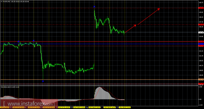 На 15-минутном графике рекомендуется рассматривать ордера на покупку с целями 156,86 и 159,78 при закреплении цены выше 153,88 (Тенкан-сен), ордером Stop Loss ниже 153,47 (Киджун-сен) и при направленном вверх MACD.
