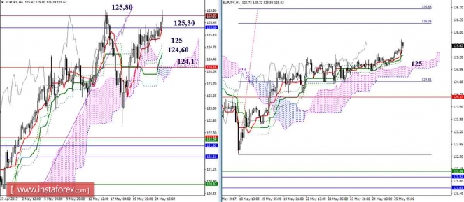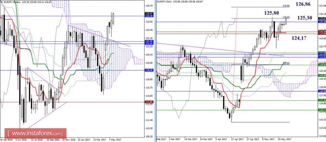 Индикатор MACD – красная линия и гистограмма с белыми барами в окне индикаторов.Материал предоставлен компанией InstaForex - www.instaforex.comДневной обзор GBP/JPY и EUR/JPY на 25.05.17. Индикатор Ишимоку