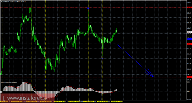 На 15-минутном графике рекомендуется рассматривать ордера на покупку с целью 156,44 при закреплении цены выше 153,38 (Тенкан-сен), ордером Stop Loss ниже 153,38 и при направленном вверх индикаторе MACD.
