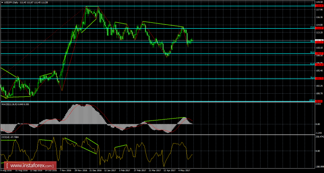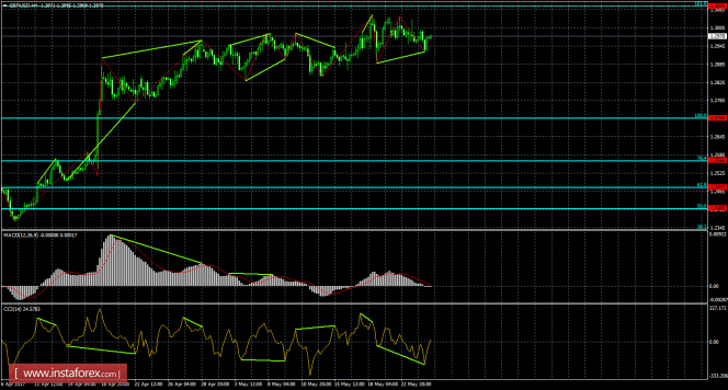 Медвежья дивергенция позволила в итоге выполнить паре небольшое падение, но сейчас образовалась новая бычья дивергенция, которая позволила выполнить разворот в пользу английского фунта и возобновить процесс роста в направлении уровня коррекции 161,8% - 1,3076. Бычья дивергенция у индикатора CCI: последний лоу котировок получился выше предыдущего, а аналогичный лоу индикатора - ниже предыдущего. Отбой курса пары 25 мая от уровня Фибо 161,8% позволит рассчитывать на разворот в пользу американской валюты и некоторое падение в направлении коррекционного уровня 100,0% - 1,2705. Проход парой последнего лоу дивергенции аналогично сработает в пользу начала падения.
