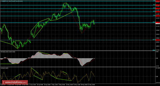 Котировки пары USD/JPY на 4-часовом графике выполнили разворот в пользу японской валюты и закрепление под уровнем Фибо 100,0% - 111,69. В итоге падение пары может быть продолжено 25 мая в направлении коррекционного уровня 161,8% - 109,32. Назревающих дивергенций сейчас не наблюдается ни у одного индикатора. Закрепление курса пары над уровнем коррекции 100,0% позволит трейдерам рассчитывать на разворот в пользу валюты Соединенных Штатов и некоторый рост в направлении коррекционного уровня 76,4% - 112,58.