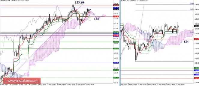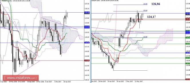 Индикатор MACD – красная линия и гистограмма с белыми барами в окне индикаторов.Материал предоставлен компанией InstaForex - www.instaforex.comДневной обзор GBP/JPY и EUR/JPY на 23.05.17. Индикатор Ишимоку