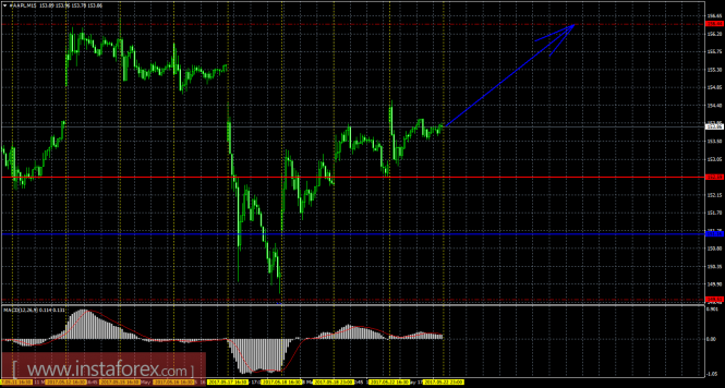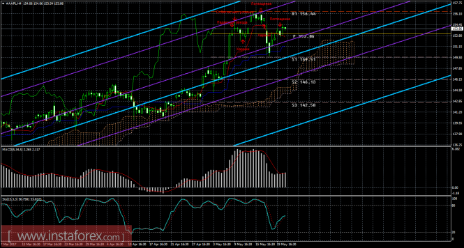 На 15-минутном графике рекомендуется рассматривать ордера на покупку с целью 156,44 при закреплении цены выше 152,59 (Тенкан-сен), ордером Stop Loss ниже 152,59 и при направленном вверх индикаторе MACD.