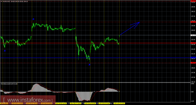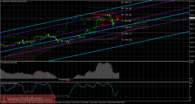 На 15-минутном графике рекомендуется рассматривать ордера на покупку с целью 156,44 при закреплении цены выше 152,87 (Тенкан-сен), ордером Stop Loss ниже 152,87 и при направленном вверх индикаторе MACD.