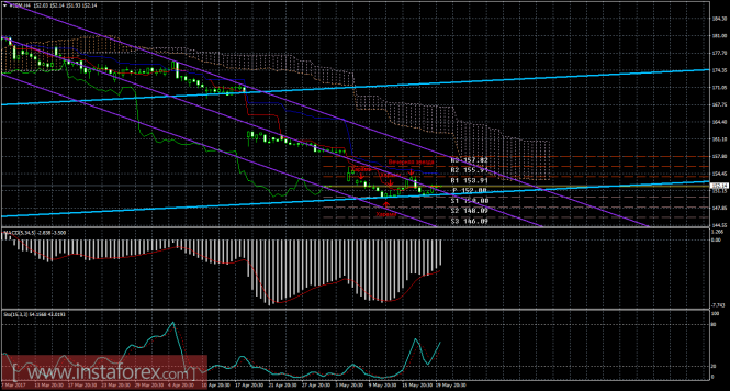 На младшем графике рекомендуется рассматривать ордера на продажу с целью 150,00 при открытии ниже 152,00 (Тенкан-сен), ордером Stop Loss выше 152,00 и при направленном вниз индикаторе MACD.