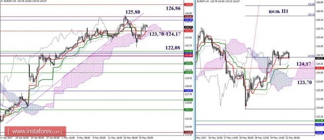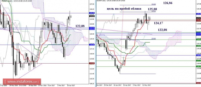 Дневное краткосрочное преимущество достигнуто совместно с младшими таймами, так как пара закрепилась выше креста и облака Н4, а так же вышла в бычью зону относительно облака Н1. Пробой сопротивлений (125,30-65) и преодоление максимума (125,80) откроет дорогу к исполнению целей на пробой облаков Ишимоку (Н1 126,66 + день 126,86). Возврат пары под ключевые поддержки 123,70 124,17 (крест Н4 + облако Н4 + Киджун Н1 + облако Н1 + дневной Тенкан) ликвидирует поддержку игроков на повышение индикатором Ишимоку и откроет дорогу для наступления медведей, ориентирами для снижения при этом будут служить уровни старших таймов и понижательная цель на пробой облака Н4.