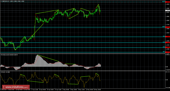 После образования на 4-часовом графике минимальной дивергенции, котировки выполнили разворот в пользу американской валюты и начали процесс падения в направлении уровня коррекции 100,0% - 1,2705. Медвежья дивергенция у индикатора CCI: последние два пика котировок и индикатора не соответствуют друг другу. Отбой курса пары 19 мая от уровня Фибо 100,0% позволит рассчитывать на разворот в пользу английского фунта и некоторый рост в направлении коррекционного уровня 161,8% - 1,3076. Новых назревающих дивергенций сейчас не видно.
