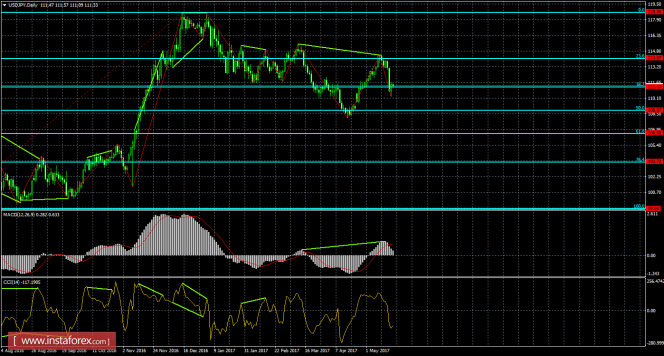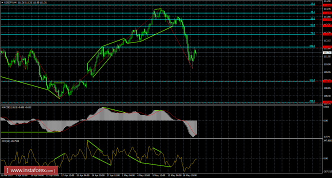 Без какого-либо сигнала пара выполнила разворот в пользу доллара США на 4-часовом графике и выполнила возврат к уровню коррекции 100,0% - 111,69. Отбой пары от уровня Фибо 100,0% позволяет ожидать возобновление падения в направлении коррекционного уровня 161,8% - 109,32. Назревающих дивергенций 19 мая не наблюдается ни у одного индикатора. Отбой котировок от уровня коррекции 161,8% позволит рассчитывать на еще один разворот в пользу валюты США и некоторый рост пары. Закрепление курса пары над уровнем Фибо 100,0% сработает в пользу дальнейшего роста.