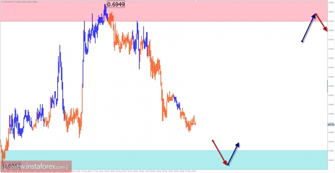 В продолжающемся весь прошедший год "боковике» на графике основой пары новозеландской валюты интерес представляет последняя, незавершенная до сих пор волна. Она имеет восходящий курс и ведет отсчет с декабря прошлого года. Нисходящие ценовые колебания с февраля сформировали среднюю часть волны. Цена пары находится вблизи верхней границы широкой, потенциально разворотной зоны графика крупного масштаба. Начавшийся 11 мая ценовой рост имеет потенциал, превышающий размер отката. Высока вероятность начала образования разворотной волновой конструкции, предшествующей смене направления краткосрочного тренда.
