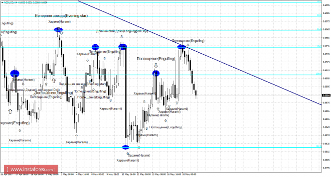 Отбой котировок от уровня Фибо 76,4% - 0,6943 и последующее образование медвежьей формации «Поглощение» позволили паре продолжить падение и выполнить закрепление под уровнем коррекции 100,0% - 0,6909. В итоге падение котировок продолжается 19 мая в направлении следующего уровня Фибо 161,8% - 0,6964. Образование бычьей формации позволит трейдерам рассчитывать на разворот в пользу валюты Новой Зеландии и возврат котировок к уровню Фибо 100,0%. Закрепление пары над уровнем коррекции 100,0% повысит шансы на продолжение роста.