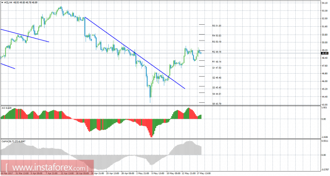 Уровни поддержки и сопротивления – красные горизонтальные линии.Материал предоставлен компанией InstaForex - www.instaforex.comТехнический анализ сырой нефти за 18 мая 2017 года