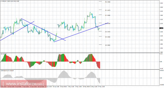 Анализ природного газа за 18 мая показывает, что цена закрепилась ниже восходящей линии тренда, поэтому сейчас стали актуальными короткие позиции. На данный момент актуально нисходящее движение с целями уровни поддержки S4 – 3,0990 и S5 – 2,9880, если цена преодолеет уровень 3,1670. Целями для начала восходящей коррекции выступают уровни 3,2780 и 3,3890, если цена останется выше 3,1670. Цена закрепилась ниже восходящей линии тренда, это означает смену тенденции на нисходящую и теперь являются актуальными короткие позиции. Индикатор Awesome показывает локальное нисходящее движение, последний закрытый бар окрашен в красный цвет. OsMA также направлен вниз, что сигнализирует о нисходящем движении цены на газ и в более долгосрочном плане. Оба индикатора в ближайшее время могут начать разряжаться. Отскок цены от уровня 3,1670 мог спровоцировать виток коррекционного движения.