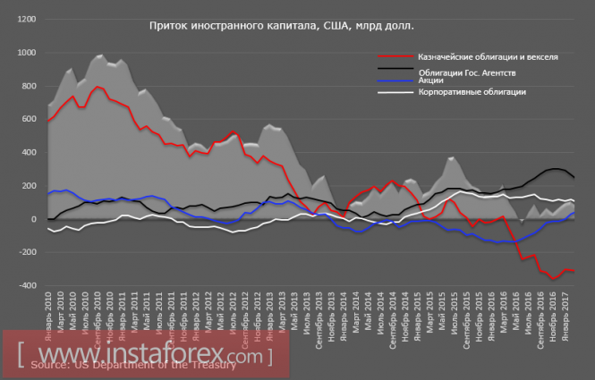 Отчет Казначейства о притоке иностранного капитала по март включительно, опубликованный в понедельник, также указывает на странную закономерность. Длившийся 39 месяцев подряд исход иностранных инвесторов с фондового рынка США завершился, и уже второй месяц подряд суммарный поток за последние 12 месяцев остается положительным. Вероятно, инвесторов привлекает потенциальное улучшение делового климата, а главное – сокращение налогов, которое сулит компаниям дополнительные прибыли и должно, по задумке, стимулировать приток инвестиций.