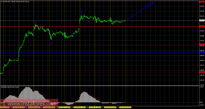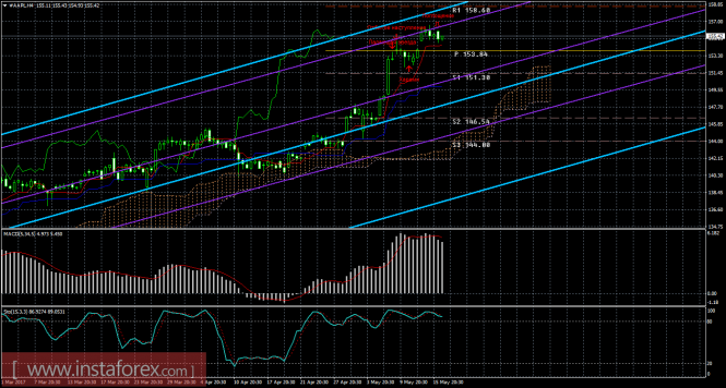 На младшем графике рекомендуется рассматривать ордера на продажу с целью 148,94 при открытии ниже 151,87 (Тенкан-сен), ордером Stop Loss выше 151,87 и при направленном вниз MACD.