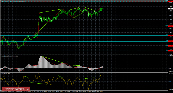 Медвежья дивергенция позволила паре выполнить небольшое падение. Далее котировки выполнили разворот в пользу валюты Англии и возобновили рост в направлении коррекционного уровня 161,8% - 1,3076. Назревающих дивергенций 18 мая нет ни у одного индикатора. Отбой курса от уровня Фибо 161,8% позволит трейдерам ожидать разворот в пользу американской валюты и некоторое падение в направлении уровня коррекции 100,0% - 1,2705, а закрепление над этим уровнем повысит шансы пары на дальнейший рост в направлении следующего уровня Фибо 200,0% - 1,3301.