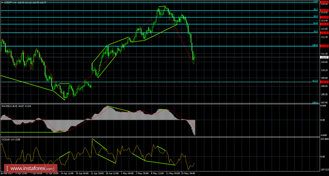 Падение котировок USD/JPY продолжается на 4-часовом графике, а пара выполнила закрепление под уровнем коррекции 100,0% - 111,69. В итоге падение курса может быть продолжено 18 мая в направлении следующего уровня Фибо 161,8% - 109,32. Назревающих дивергенций не наблюдается ни у одного индикатора. Отбой котировок от уровня коррекции 161,8% позволит трейдерам ожидать разворот в пользу валюты США и некоторый рост в направлении коррекционного уровня 100,0% - 111,69. Закрепление курса пары под уровнем Фибо 161,8% повысит шансы на дальнейшее падение.