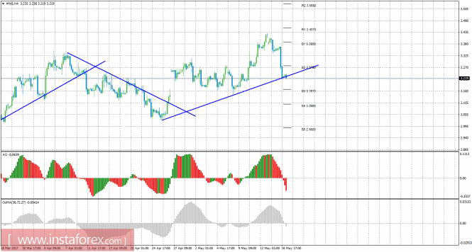 Красная линия и гистограмма с белыми барами в окне индикаторов.Материал предоставлен компанией InstaForex - www.instaforex.comТехнический анализ природного газа за 17 мая 2017 года