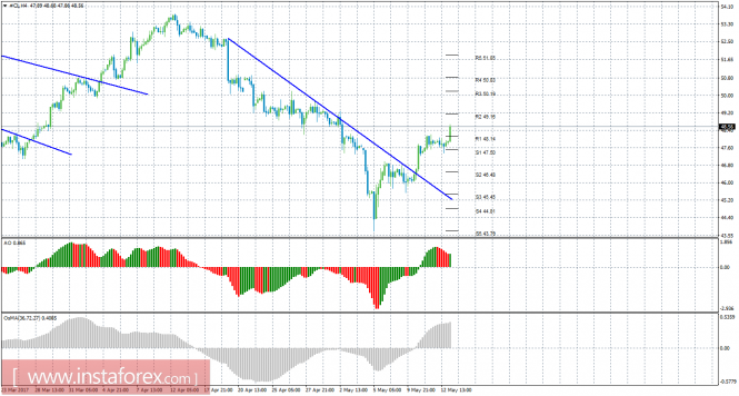 Уровни поддержки и сопротивления – красные горизонтальные линии.Материал предоставлен компанией InstaForex - www.instaforex.comТехнический анализ сырой нефти за 15 мая 2017 года