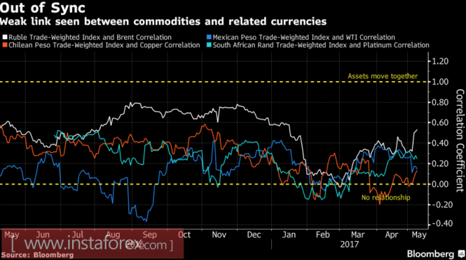 Рубль продолжает пользоваться преференциями валюты EM. Высокие процентные ставки долгового рынка в условиях падения волатильности поддерживают стабильно сильный спрос на местные активы со стороны carry-трейдеров. Согласно данным EPFR Global, инвесторы по итогам пятидневки к 3 мая вложили $2,5 млрд в биржевые специализированные фонды, ориентированные на долговые рынки развивающихся стран. Приток продолжается на протяжении 14 последних недель подряд, при этом данный фактор приводит к снижению корреляции товарных валют с ценами на сырьевые активы. Падение связи «россиянина» с нефтью далеко не самое большое по сравнению с другими денежными единицами EM.