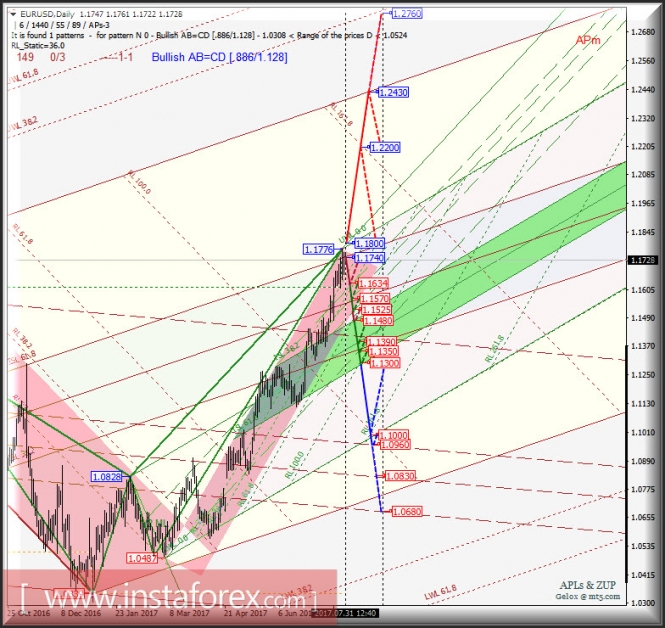 Индикатор MACD – красная линия и гистограмма с белыми барами в окне индикаторов.Материал предоставлен компанией InstaForex - www.instaforex.comEUR/USD Daily. Перспективы развития движения в августе-сентябре 2017 г. Анализ APLs & ZUP