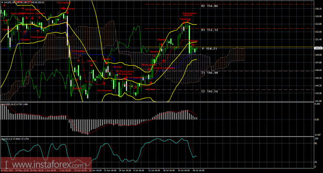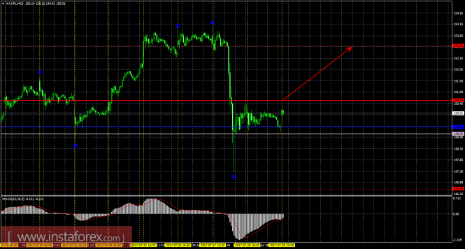 На 15-минутном графике рекомендуется рассматривать ордера на покупку с целью 153,13 при закреплении цены выше 150,59 (Тенкан-сен), ордером Stop Loss ниже 150,59 и при направленном вверх MACD.