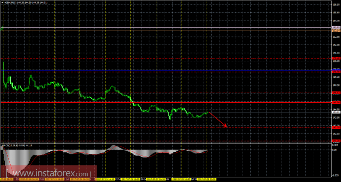 Цена акций IBM продолжает движение вниз. На текущем графике рекомендуется рассматривать шорты с целями 144,24 и 141,48. Стоп лосс рекомендуется выставлять выше критической линии (149,10). Закрывать вручную ордера на продажу можно будет при развороте индикатора MACD наверх (при параллельном повышении цены), при формировании бычьей модели (с подтверждением), а также при отскоке от уровня 144,24. Длинные позиции на данный момент не актуальны.