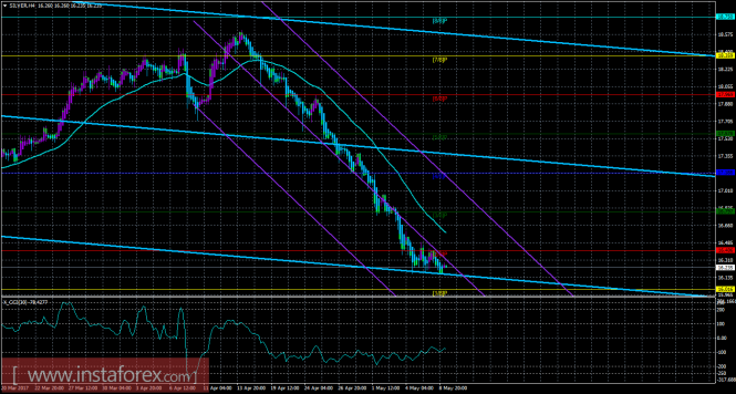 Валютная пара продолжает построение восходящего набора волн. Повышение котировок может продолжиться в рамках предполагаемой волны с, в с, в с, в E, в (B) с целями, расположенными около отметки 1,1018, что соответствует 38,2% по Фибоначчи, и выше около 11 фигуры. В рамках коррекционной волны в составе с, в с, в с, в E, в (B) понижение котировок началось с целями, находящимися около отметки 1,0884, что соответствует 76,4% по Фибоначчи.Материал предоставлен компанией InstaForex - www.instaforex.comТехническая картина инструмента SILVER по системе «Каналы регрессии» за 9 мая 2017 года