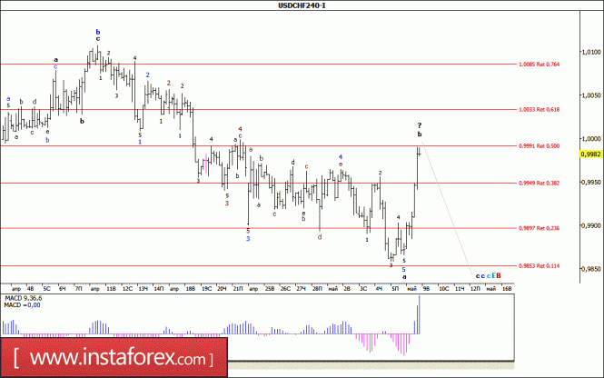 Инструмент продолжает построение волны Е, в С, в (В). В рамках построения волны с, в а, в Е, в С, в (В), повышение котировок продолжается с целями, находящимися около отметок 113,11 и 113,65, что приравнивается к 61,8% и 76,4% по Фибоначчи, и около 114,50. В рамках волны b, в с, в а, в Е, в С, в (В) (если усложнится) понижение котировок может возобновиться с целями, расположенными около отметки 112,25, что соответствует 38,2% по Фибоначчи, и ниже на подходе к 111 фигуре. Волновая разметка предполагаемой волны а, в Е, в С, в (В) принимает весьма сложный и протяженный вид.Материал предоставлен компанией InstaForex - www.instaforex.comВолновой анализ валютной пары USD/CHF за 9 мая 2017 года