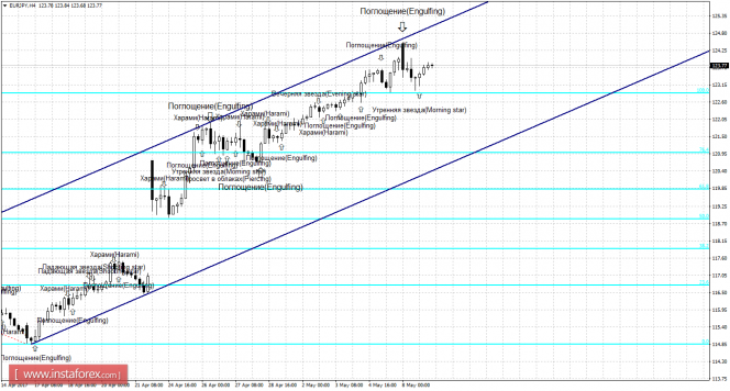 Медвежья свечная формация «Поглощение» позволила паре выполнить некоторое падение котировок, но после образования бычьей формации «Утренняя звезда» пара выполнила разворот в пользу европейской валюты и начала рост в направлении коррекционного уровня 161,8% - 127,87. Образование 9 мая медвежьей формации позволит ожидать разворот в пользу валюты Японии и некоторое падение в направлении уровня коррекции 100,0% - 122,90. Такая формация будет трактоваться как коррекционная, исходя из направления равноудаленного канала. Закрепление курса под уровнем Фибо 100,0% повысит шансы на дальнейшее падение.