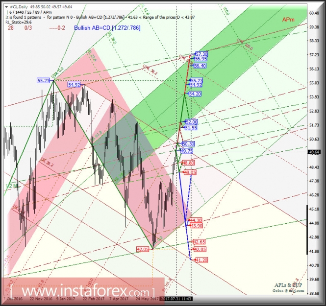 Развитие движения цены инструмента (#CL) в августе-сентябре 2017 г. будет обусловлено отработкой границ каналов 1/2 Median Line вил операционных масштабов -> Minute (48.05 <-> 49.75 <-> 51.55) и Minor (48.80 <-> 50.30 <-> 52.00).