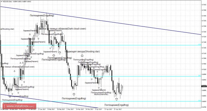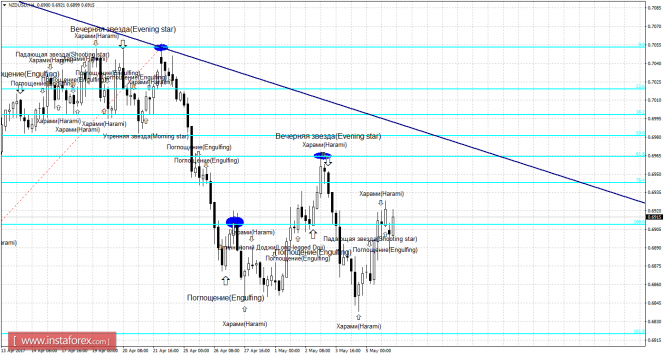 Без образования бычьей свечной формации пара выполнила разворот в пользу новозеландской валюты и начала рост в направлении коррекционного уровня 38,2% - 0,6976. Образование медвежьей формации позволит рассчитывать на разворот в пользу валюты США и некоторое падение в направлении уровня коррекции 50,0%. Такая формация будет являться трендовой, так как канал имеет направление «вниз». Отбой курса пары от уровня Фибо 38,2% аналогично позволит ожидать некоторое падение. Закрепление котировок над уровнем коррекции 38,2% повысит вероятность продолжения роста в направлении уровня Фибо 23,6% - 0,7171.